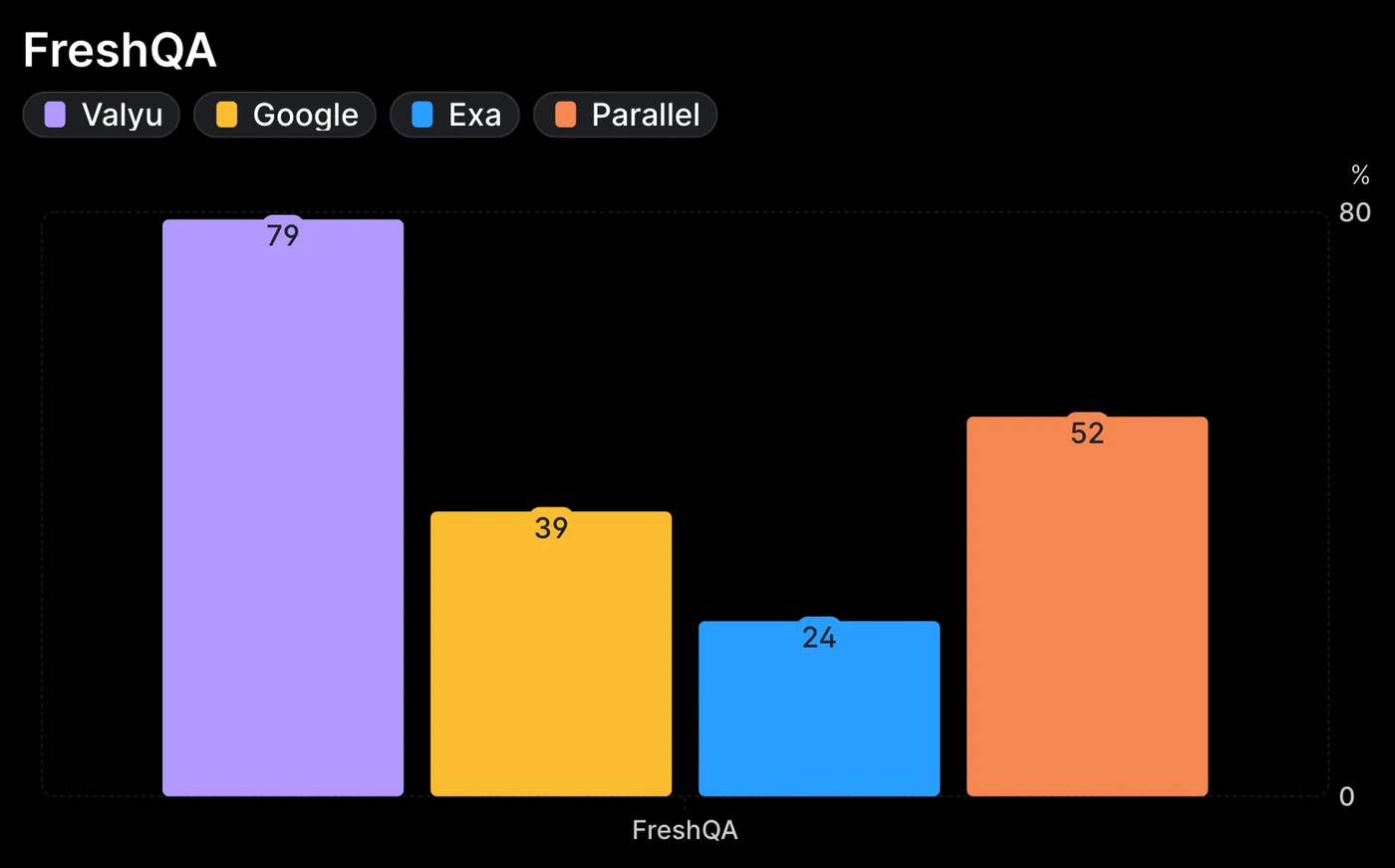 | FreshQA (600 time-sensitive queries) | 79 % | 52 % | 24 % | 39 % | (valyu.ai) |